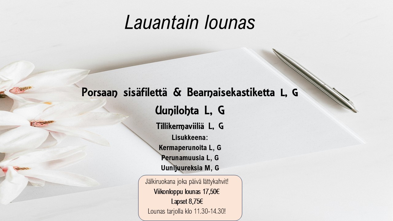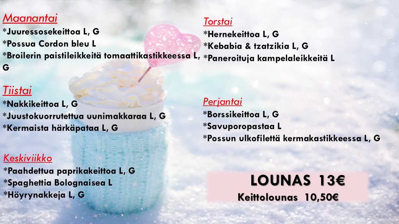 Noutopöytälounas arkisin klo 10.30 - 14.30, Ma - Pe. Myös take away lounas!