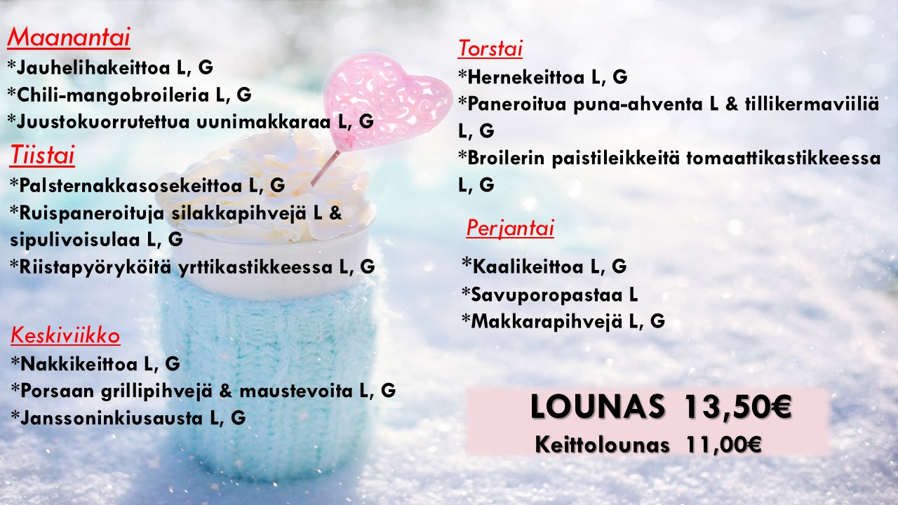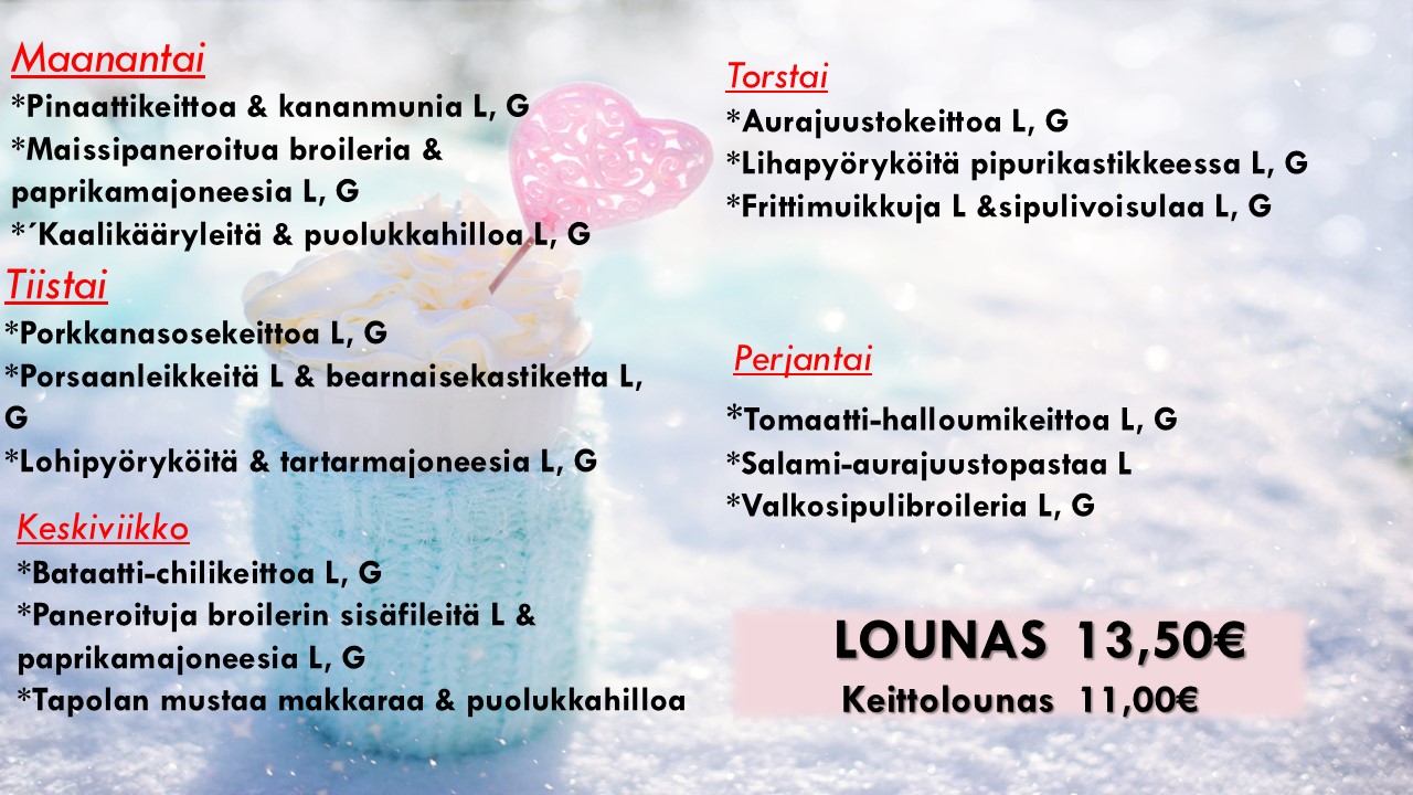 Noutopöytälounas arkisin klo 10.30 - 14.30, Ma - Pe. Myös take away lounas!